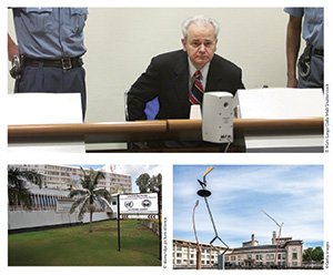 Clockwise from top: Slobodan Milosevic, former President of Yugoslavia, at the start of his trial at the International Criminal Tribunal for the former Yugoslavia (ICTY), The Hague, 13 February 2002. | The ICTY in The Hague was established in 1993, ran for 24 years and concluded in 2017. | The International Criminal Tribunal for Rwanda (ICTR) was established in 1994 with its seat in Arusha, Tanzania and concluded in 2014.